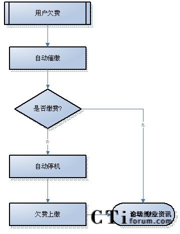 - 支持對(duì)后付費(fèi)用戶催繳:該類用戶采用先打電話,按期交費(fèi),超過規(guī)定期限即視為欠費(fèi),系統(tǒng)開始催繳。一旦用戶到營(yíng)業(yè)窗口補(bǔ)交話費(fèi),系統(tǒng)即停止催繳。