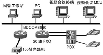 通過在BDCOM3660路由器上配置相應的CE1、語音等功能模塊,中心20個E1接口可通過SDH連接17個地市氣象局和重要的氣象站(共20個),同時可供20部電話用以VoIP通話;中心BDCOM3660路由器每臺配兩個10/100M以太網(wǎng)端口,使得數(shù)據(jù)和視頻分開,防止網(wǎng)絡的廣播風暴。