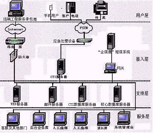 寬帶信息公司目前已建立了完善的客戶資料管理體系,能夠受理客戶客戶的業(yè)務(wù)受理、咨詢、投訴建議等,并有自己的郵件服務(wù)器和"企信通"短信服務(wù)器,因此,應(yīng)當(dāng)充分利用公司已有的系統(tǒng)設(shè)備,綜合公司實際的業(yè)務(wù)管理需要,客戶服務(wù)中心的熱線系統(tǒng)采用C/S三層體系結(jié)構(gòu),而后臺、客戶服務(wù)部門及其他部門之間的采用B/S體系結(jié)構(gòu),實現(xiàn)投訴事件在公司內(nèi)部各部門的傳遞、跟蹤管理,從而整合公司各部門資源為用戶及時周到的提供全程服務(wù)。