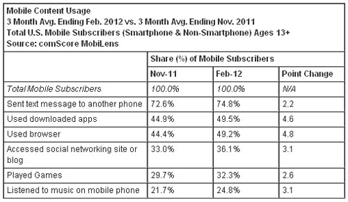 按截至今年2月份的三個(gè)月的平均數(shù)計(jì)算,美國(guó)手機(jī)用戶中有74.8%的用戶利用手機(jī)發(fā)送短信,相比截止去年11月的三個(gè)月上升2.2個(gè)百分點(diǎn);有49.5%的用戶使用了下載的應(yīng)用程序(上升4.6個(gè)百分點(diǎn)),有49.2%的用戶使用瀏覽器(上升4.8個(gè)百分點(diǎn)),有36.1%的用戶訪問社交網(wǎng)站或博客(上升了3.1個(gè)百分點(diǎn));有32.3%有用戶利用手機(jī)玩游戲(上升2.6個(gè)百分點(diǎn)),有24.8%的用戶利用手機(jī)聽音樂(上升3.1個(gè)百分點(diǎn))。