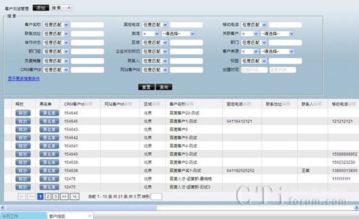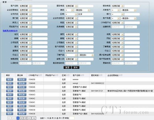 例如,以區(qū)域?yàn)闂l件進(jìn)行搜索,區(qū)域選擇北京后,點(diǎn)擊查詢(xún),你想要的北京區(qū)域的客戶(hù)全部出現(xiàn)在客戶(hù)列表中。