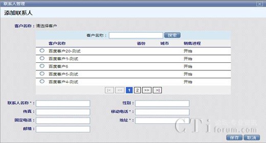 聯(lián)系人管理與客戶(hù)管理操作方法大致相同,功能相當(dāng)于客戶(hù)管理下客戶(hù)資料內(nèi)的添加聯(lián)系人功能。您可以按客戶(hù)名稱(chēng)為搜索條件選擇所要添加聯(lián)系人的目標(biāo)客戶(hù)。
