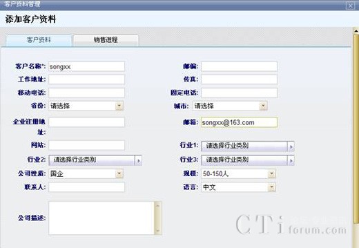 對(duì)新添加的客戶(hù)錄入客戶(hù)信息資料,包括客戶(hù)的名稱(chēng)、郵箱等,為其建立起一個(gè)新的客戶(hù)關(guān)系,可以隨時(shí)找到該客戶(hù)的具體信息以及他的銷(xiāo)售情況,方便對(duì)客戶(hù)銷(xiāo)售進(jìn)程有一個(gè)充分地實(shí)時(shí)跟蹤,并為之更好地服務(wù)。