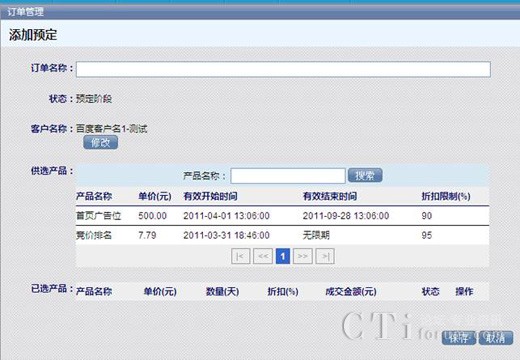選擇訂單的名稱(chēng),供客戶(hù)選擇的產(chǎn)品,在供選產(chǎn)品列表下選擇產(chǎn)品名稱(chēng),然后所選的產(chǎn)品就會(huì)出現(xiàn)在已選產(chǎn)品列表下,完成后點(diǎn)擊【保存】,這樣一個(gè)訂單就生成了。