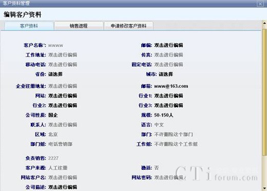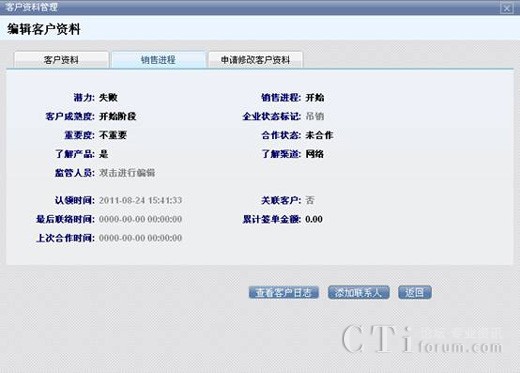 點(diǎn)擊標(biāo)簽選擇要查看的客戶(hù)資料,和銷(xiāo)售進(jìn)程。查看客戶(hù)日志能看到該客戶(hù)被執(zhí)行操作的歷史情況,例如資料的變更,所屬的變更等等。添加聯(lián)系人是指為當(dāng)前客戶(hù)添加新的聯(lián)系人,添加完聯(lián)系人信息后,聯(lián)系人就會(huì)被納入到該客戶(hù)資料里。