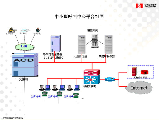 中小型呼叫中心平臺具有較強的擴展能力,可以支持100座席左右的呼叫中心,每天的呼叫處理量在5000~10000人/次。當(dāng)您希望建設(shè)一個中小規(guī)模、成本相對低廉、實施方便、快速、配置靈活的呼叫中心可以考慮采用HOLLYCRM中小型呼叫中心解決方案。