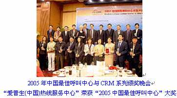 中國(guó)國(guó)際呼叫中心與客戶關(guān)系管理大會(huì)(ICC CHINA 2005)主辦的"中國(guó)最佳呼叫中心"的評(píng)選活動(dòng)中,"愛普生(中國(guó))熱線服務(wù)中心"憑借著自建成以來顯著改進(jìn)并提升了公司運(yùn)營(yíng)管理水平及客戶滿意度,并且在很大程度上增加了由呼叫中心直接或間接為企業(yè)帶來利潤(rùn)的絕對(duì)優(yōu)勢(shì),從而榮獲此殊榮。