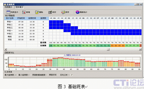 引入呼叫中心排班系統(tǒng)是提升坐席資源利用率的有效解決方案,排班系統(tǒng)可以對大量的歷史呼叫數(shù)據(jù)進(jìn)行分析,并剔除特殊事件對呼叫量的影響,從而得出呼叫量變化的規(guī)律曲線,再輔助對特殊預(yù)期事件影響度的疊加,可以對未來一定時間的呼叫量變化做出比較客觀的預(yù)測(圖2)。在預(yù)測話務(wù)量變化曲線的同時,結(jié)合人員技能和班次設(shè)定,給出高擬合度的人工排班方案(圖3)。更為重要的是,成熟排班系統(tǒng)提供的話務(wù)預(yù)測模型多具備學(xué)習(xí)能力,能夠?qū)㈩A(yù)測的話務(wù)數(shù)據(jù)與實際話務(wù)數(shù)據(jù)進(jìn)行對比,從而不斷提高話務(wù)預(yù)測模型的預(yù)測精度。成熟排班工具可以在保持呼叫中心同等服務(wù)水平的前提下,降低人工坐席代表的投入數(shù)量,進(jìn)而釋放部分人工資源開展其它業(yè)務(wù)。