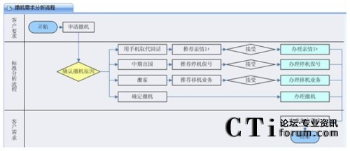 客戶呼入之后,座席人員要做的第一件事情就在IT系統(tǒng)的支持下先去捕獲客戶訴求,不用擔心座席會混淆相似的業(yè)務類型,因為呼叫中心針對典型的業(yè)務訴求會做出非常詳盡的引導流程,相似的或者關(guān)聯(lián)的業(yè)務類型在此流程中會體現(xiàn)出來,座席人員可以點擊,快捷地出入于各業(yè)務類型的引導圖,通過比較、判斷,最終定位出客戶真正訴求。例如下文客戶呼入本來想做“撤機”業(yè)務,通過業(yè)務引導圖,最終定位到了客戶的真正訴求,辦理了停機保號業(yè)務或者移機業(yè)務。
