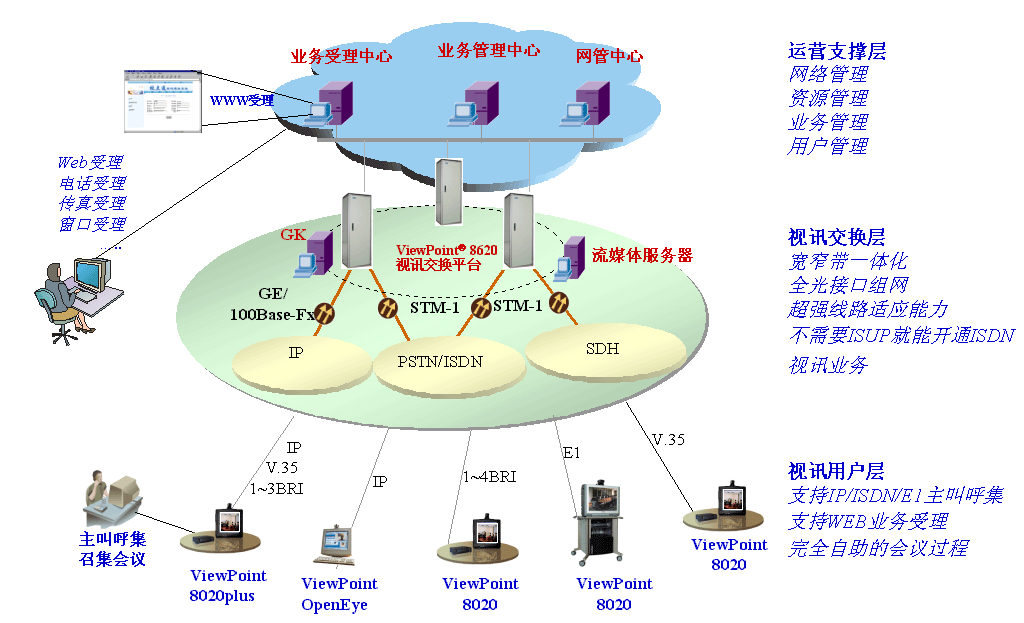 面對公眾視訊業(yè)務發(fā)展的契機,由于基于窄帶H.320的視訊系統(tǒng)較為成熟,而基于IP網(wǎng)的H.323系統(tǒng)被普遍看好,ISDN目前是最方便的公眾視訊系統(tǒng)接入手段,相對于其他接入方式(如E1、DDN、FR、ATM、IP等)使用方便,可方便通過撥號方式與任何聯(lián)網(wǎng)地區(qū)建立會議。ViewPoint 8620視訊交換平臺采用寬窄帶一體化設計,可為各行各業(yè)用戶提供完備的一體化解決方案,不僅能提供大容量ISDN用戶撥號接入,還能提供大容量的E1/V.35/IP方式接入。公眾視訊業(yè)務的發(fā)展,將視訊業(yè)務從單純?yōu)樯贁?shù)特定用戶群提供遠程會議服務,轉而面向公眾,為各行各業(yè)提供視訊業(yè)務。