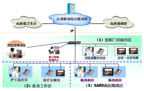 。。山西移動通信公司在獲悉遠程視訊業(yè)務可以有效預防SARS的情況下,隨即與山西省政府、省衛(wèi)生廳通電話,表達了山西移動愿意為山西防治SARS工作提供更先進的通信技術(shù)支持。山西移動與華為技術(shù)有限公司旋即制定了“愛心連線”遠程醫(yī)療、遠程探視實施方案,省衛(wèi)生廳及下屬太原市7家醫(yī)院要求盡快實施。目前該系統(tǒng)已經(jīng)在山西省山大第一醫(yī)院開通,正值國家衛(wèi)生部SARS督察小組在山西各大醫(yī)院視察“防非”工作,整個系統(tǒng)運行穩(wěn)定,在SARS的防治工作中發(fā)揮了重要作用。