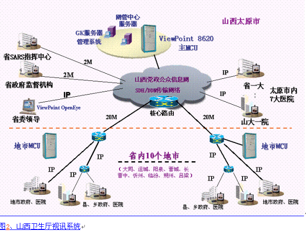 在山西省抗擊非典的關(guān)鍵時(shí)期,為了解決非典信息溝通不暢,資源整合不夠等問題,山西省衛(wèi)生廳緊急組建視頻會(huì)議網(wǎng)絡(luò),要求能夠容納非典防治指揮中心、省疾病會(huì)議控制中心、省一大、省兒童醫(yī)院、山大一院、山大二院及衛(wèi)生廳領(lǐng)導(dǎo)、省委領(lǐng)導(dǎo)辦公室等十幾個(gè)非典防治重要部門,從整個(gè)政務(wù)往來(lái)看,系統(tǒng)要求具有高度穩(wěn)定性、良好的音視頻效果以及方便易用。經(jīng)測(cè)試,采用華為技術(shù)有限公司的ViewPoint