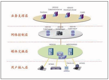 VV-SYS的業(yè)務支撐層大大增強了視訊系統(tǒng)的交互性和智能性,業(yè)務支撐層包括Quidway XE6000 MeetingScheduler會議調度系統(tǒng)、XE6300
