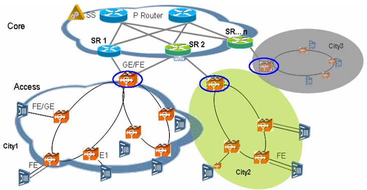 綜合接入主要關(guān)注語(yǔ)音和少量寬帶業(yè)務(wù)和專線,上行接口一般是E1和FE/GE。傳統(tǒng)窄帶語(yǔ)音業(yè)務(wù)、TDM專線等或MSAN使用于窄帶交換機(jī)組網(wǎng)的時(shí)候采用E1上行方式,其它時(shí)候采用FE/GE上行。接入層面采用的承載網(wǎng)設(shè)備必須同時(shí)能夠支持E1和FE/GE接入,因此承載網(wǎng)設(shè)備必須具備多業(yè)務(wù)傳輸特性,傳統(tǒng)SDH設(shè)備,傳統(tǒng)LANSwitch設(shè)備無法滿足組網(wǎng)需求。