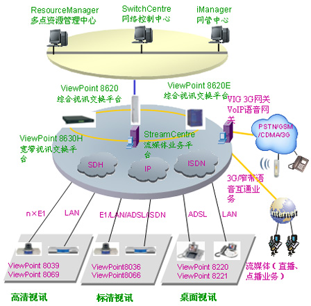 華為公司針對企業(yè)多媒體通信的實際需求,推出了高清晰視訊系統(tǒng)多媒體視訊通信解決方案,系統(tǒng)的組網(wǎng)結(jié)構(gòu)如下圖: