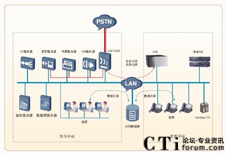客戶電話通過PSTN統(tǒng)一由華為UAP3300排隊機接入,由華為平臺的IVR服務(wù)器進行業(yè)務(wù)導(dǎo)航分流,根據(jù)用戶的選擇和IVR流程的配置進行路由,可以選擇不同平臺來處理此業(yè)務(wù)。來話根據(jù)IVR流程路由后,兩個平臺采用負荷分擔(dān)方式進行工作。在將來話導(dǎo)入兩個平臺后,采用不同設(shè)備的IVR進行業(yè)務(wù)分配,不同平臺的座席處理不同的業(yè)務(wù)。在處理過程中,不同平臺的座席之間可以互轉(zhuǎn),達到全網(wǎng)資源共享的功能。