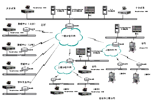 中國工商銀行此前已具備覆蓋一級分支機(jī)構(gòu)的衛(wèi)星視頻會(huì)議系統(tǒng)和部分基于TCP/IP網(wǎng)絡(luò)的二級分支機(jī)構(gòu)的H.323視頻會(huì)議系統(tǒng),并在此網(wǎng)絡(luò)中使用了包括寶利通在內(nèi)的多家廠商的產(chǎn)品。但是,隨著機(jī)構(gòu)業(yè)務(wù)的不斷擴(kuò)大,原有系統(tǒng)已無法滿足目前的需要。而網(wǎng)絡(luò)技術(shù)的快速發(fā)展,使地面通訊線路的使用成本大幅降低,地面網(wǎng)絡(luò)的穩(wěn)定性、易維護(hù)性、帶寬可擴(kuò)充性也使視頻會(huì)議系統(tǒng)的傳輸由傳統(tǒng)的較昂貴的衛(wèi)星專用信道轉(zhuǎn)向地面TCP/IP網(wǎng)絡(luò)成為大勢所趨。因此,工行決定在全行范圍內(nèi)替換原有H.320視頻會(huì)議系統(tǒng),神州數(shù)碼應(yīng)用網(wǎng)絡(luò)事業(yè)部基于中國工商銀行視頻會(huì)議系統(tǒng)特點(diǎn)采用TCP/IP網(wǎng)絡(luò)的H.323視頻會(huì)議系統(tǒng)。