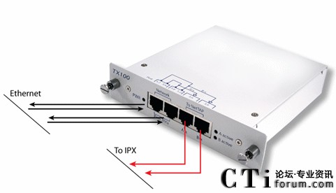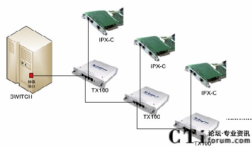 將TX100直接高阻搭接在網(wǎng)絡(luò)中的任何位置,兩個Network端口高阻搭接在主干網(wǎng)上,另兩個端口Monitor A和Monitor B將上行數(shù)據(jù)流和下行數(shù)據(jù)流轉(zhuǎn)發(fā)至IPX卡上。