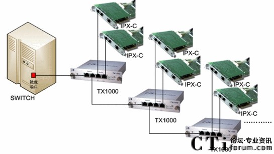 ID上的數(shù)據(jù),實(shí)現(xiàn)千兆輸入,百兆輸出。這樣搭接的最大優(yōu)點(diǎn)在于TX1000是高阻搭接在網(wǎng)絡(luò)上的,保證了錄音系統(tǒng)對(duì)原有網(wǎng)絡(luò)上的數(shù)據(jù)沒有任何影響。
