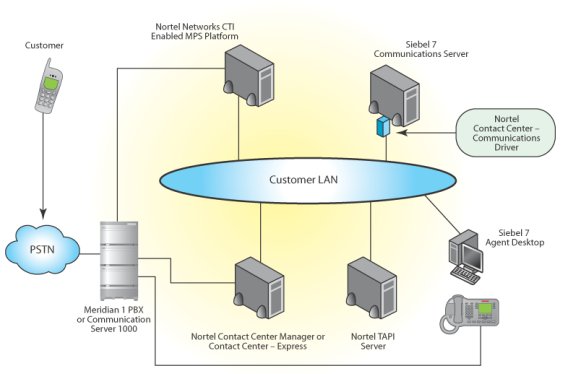 客戶、PSTN、北電網(wǎng)絡(luò)支持CTI的MPS平臺、Siebel7通信服務(wù)器、北電聯(lián)絡(luò)中心通信驅(qū)動器、客戶LAN、Meridian 1