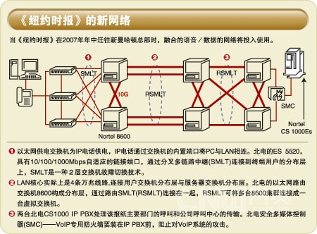 VoIP架構是基于北電的通信服務器CS 1000平臺,該平臺是一種基于服務器的IP PBX。CS 1000是基于北電的Meridian PBX特性集合,其主機運行在一臺來自WindRiver系統(tǒng)公司的VxWorks實時操作系統(tǒng)的IP服務器上。一對冗余的CS1000將為新聞、廣告、發(fā)行和其他部門中大約3600 部IP電話以及部署在《紐約時報》的分類/顯示廣告呼叫中心的300部IP軟電話提供服務。CS 1000提供對34臺以上的媒體網(wǎng)關和18臺信令服務器(部署在網(wǎng)絡中為內(nèi)網(wǎng)連接的不同部門提供VoIP呼叫建立和信令的分布式專用設備)的集中管理。