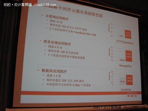 在溝通會(huì)上,喻思成用數(shù)字來(lái)告訴媒體Oracle中間件云服務(wù)器的Java應(yīng)用性能和可靠性在甲骨文進(jìn)行的內(nèi)部測(cè)試中,單機(jī)架Oracle Exalogic Elastic Cloud顯示: 互聯(lián)網(wǎng)應(yīng)用性能提高12倍,達(dá)到每秒100萬(wàn)HTTP以上;消息處理應(yīng)用性能提高4.5倍,每秒能處理超過(guò)180萬(wàn)條消息。