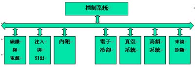 同步輻射設備以系統(tǒng)分類可分為磁鐵系統(tǒng)、電源系統(tǒng)、高頻系統(tǒng)、注入與引出系統(tǒng)、電子冷卻系統(tǒng)、內(nèi)靶系統(tǒng)、真空系統(tǒng)、束流診斷系統(tǒng)、控制系統(tǒng)、準直與測量系統(tǒng)。系統(tǒng)架構(gòu)圖如下:
