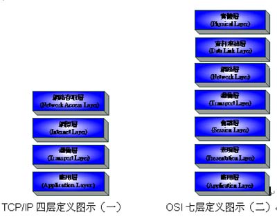 Standard Organization)所制定的標(biāo)準(zhǔn), 下面三層偏硬件,上面三層偏軟件,中間一層偏軟件硬件間的溝通。兩種標(biāo)準(zhǔn)協(xié)議圖(一)和圖(二)來作簡單說明.