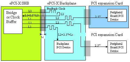 由于加了PCI-X,底板上的時鐘的長度就成為關(guān)鍵了。規(guī)范的作者要定義應(yīng)能與各種底板互操作的SHB。這挑戰(zhàn)是在SHB上的PCI-X接口需要一個具有相等于底板上時鐘走線長度延時的反饋時鐘。這反饋時鐘是在底板上并且它的長度是以從SHB插槽到PCI插板插槽的時鐘的長度為基礎(chǔ)的。在下面畫的圖中,從橋到三個目的地中任何一個的時鐘距離是相同長度的。