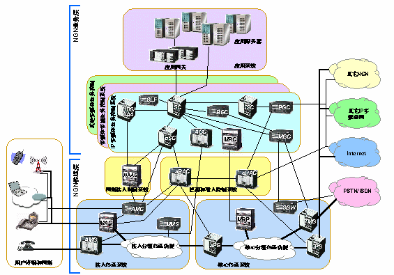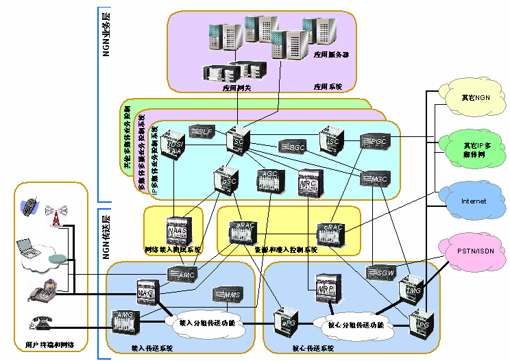 NGN是基于分組技術(shù)和多層網(wǎng)絡結(jié)構(gòu)的未來電信網(wǎng)絡。它可支持所有可能的業(yè)務,包括使用各種媒體類型和轉(zhuǎn)播方式的、具有不同性能要求的業(yè)務。它的業(yè)務與傳送分離、控制與用戶數(shù)據(jù)處理分離的構(gòu)架允許網(wǎng)絡中各個部件可分別配備和獨立發(fā)展。業(yè)務的提供采用具有開放接口的業(yè)務平臺,可以為第三方業(yè)務提供者所使用。傳送層采用可支持不同帶寬和端到端QoS能力的技術(shù)。NGN控制功能可分布于現(xiàn)有和新的網(wǎng)絡基礎(chǔ)設施上并可按組網(wǎng)的要求采用不同的組合形式。網(wǎng)關(guān)提供NGN不同域之間或NGN和現(xiàn)有網(wǎng)絡之間的互通。NGN支持通用移動性,使用戶或其他移動體無論其位置或技術(shù)環(huán)境的變化都能進行通信和接入業(yè)務。它允許用戶可以跨越不同的有線或無線接入技術(shù),跨越現(xiàn)有網(wǎng)絡的界限使用他們的業(yè)務。| AGC Access Gateway Controller AMC Access Management Controller AMG Access Media Gateway AS Application Server BGC Breakout Gateway Controller MAG Multimedia Access Gateway MGC Media Gateway Control Function MGW Media Gateway MMS Mobility Management Subsystem MRC Multimedia Resource Controller MRP Multimedia Resource Processor NAAS Network Access Attachment Subsystem |