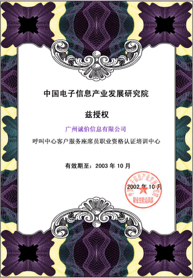 近日,廣州誠伯信息有限公司正式成為信息產(chǎn)業(yè)部電子行業(yè)技能鑒定指導(dǎo)中心授權(quán)的"呼叫中心職業(yè)標(biāo)準(zhǔn)體系"培訓(xùn)單位。