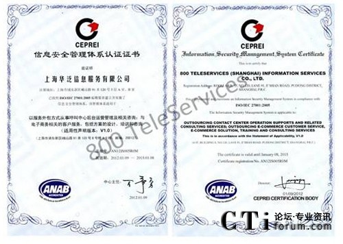 CTI論壇(ctiforum)1月31日消息(記者 浩宇):2012年1月,著名的服務外包呼叫中心和電子商務運營中心企業(yè)--飛翱集團旗下全資子公司上海華泛信息服務有限公司---,繼2009年獲得ISO9001 質量管理體系國際認證后。經過半年嚴格的綜合考評,再次成功獲得又一由國際上公認的ISO/IEC 27001:2005(也簡稱為:ISO27001)并獲得具有美國認證機構國家認可委員會ANAB授予的雙重信息安全管理體系認證。