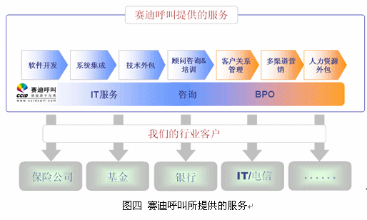 同時,賽迪呼叫所推薦給企業(yè)的并非只是軟件,而是結合了賽迪呼叫豐富的運營服務經(jīng)驗、技術服務能力的全方位信息化服務。賽迪呼叫的這種全面的信息化服務,涵蓋IT服務、咨詢服務、BPO等,圖四給出了相應展示。