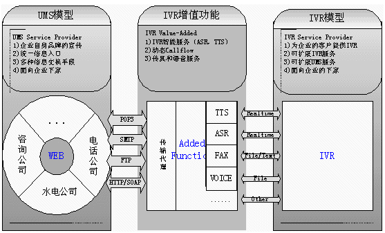 。ǘ㊣VR系統(tǒng)的傳統(tǒng)缺點(diǎn)是缺乏智能化,流程更改困難,播放的語(yǔ)音或者內(nèi)容必須預(yù)先錄制.所以我們提供UMS服務(wù),增強(qiáng)IVR的功能. 使我們的IVR功能增強(qiáng)(Ext-IVR Service Provider)