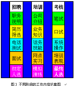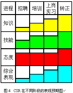 即使經(jīng)過規(guī)范的上崗培訓(xùn)與考核,新員工通常也只達(dá)到老員工70%左右的表現(xiàn)。因此制定明確的實(shí)習(xí)期,在實(shí)習(xí)期間加強(qiáng)指導(dǎo)和培養(yǎng)是非常重要的。通常經(jīng)過3個(gè)月的實(shí)習(xí),新員工已經(jīng)可以達(dá)到一個(gè)標(biāo)準(zhǔn),這時(shí)便可以轉(zhuǎn)正了。圖3和圖4表現(xiàn)了不同階段對CSR的不同預(yù)期,以及不同階段的主要工作。
