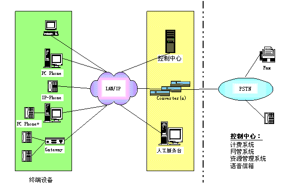 控制中心:包括資源管理系統(tǒng)、計費系統(tǒng)、網(wǎng)管系統(tǒng)、語音信箱。 其中,資源管理系統(tǒng)主要執(zhí)行地址翻譯、權限控制、路由管理等功能;計費系統(tǒng)主要完成計費及結(jié)算功能;網(wǎng)管系統(tǒng)完成對網(wǎng)絡及IP PBX運行的維護管理