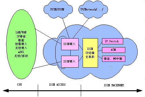 BACKBONE(骨干網(wǎng))、ISIN ACCESS(接入網(wǎng))和ISIN CPE(用戶端系統(tǒng)設備),可以構成向用戶提供語音、數(shù)據(jù)、圖像等綜合業(yè)務的統(tǒng)一的ISIN網(wǎng)絡體系。