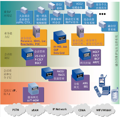。。阿爾卡特朗訊會話管理實(shí)現(xiàn)IMS的P-CSCF、I/S-CSCF和BGCF的功能,網(wǎng)關(guān)控制包括MGCF和IBCF。會話管理支持2G/3G的GGSN、CAMD的PDSN、WLAN的PDG、固定有/無線的ABG的接入和會話處理。