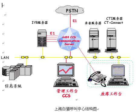 隨著企業(yè)間相互競爭的加劇,用戶對企業(yè)服務要求的提高,越來越多的企業(yè)承諾為用戶提供一個24小時的客戶服務環(huán)境,用戶可以隨時獲得聲音、文字、文件等服務。而呼叫中心可為企業(yè)解決這些問題。阿爾卡特作為著名的企業(yè)通信產(chǎn)品供應商,可以為企業(yè)提供一套完整的多媒體呼叫中心平臺解決方案。上海白貓有限公司是國內著名的洗滌系列產(chǎn)品供應商,提供多種渠道為分銷商和用戶提供產(chǎn)品和服務。面對競爭對手,面對客戶的要求,上海白貓決定建設電子商務平臺,通過電話、傳真、郵件、網(wǎng)站各種接入手段,結合公司的物流系統(tǒng),倉庫管理,網(wǎng)站系統(tǒng),建立客戶關系管理,經(jīng)營策略分析。從而鞏固其在同行業(yè)的地位,獲得更大的競爭力。阿爾卡特為上海白貓有限公司提供OmniPCX 4400交換機解決方案。采用CCD排隊軟件,采用CCS呼叫管理軟件。CTI中間件采用CT-Connect。