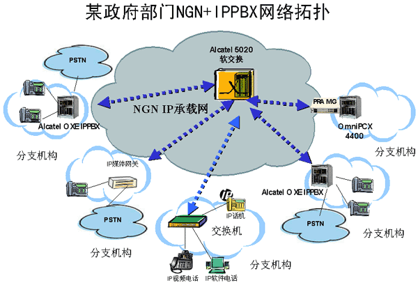 上海貝爾阿爾卡特提出的用NGN整合IP PBX的解決方案,在政府、郵政、酒店、跨國(guó)企業(yè)等領(lǐng)域得到了很多成功的應(yīng)用,下面以國(guó)家政府某部門(mén)的部署方案為例來(lái)詳細(xì)介紹NGN+IP