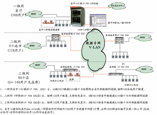 根據(jù)合同,阿爾卡特將提供1套Omni PCX Enterprise(面向大中型企業(yè)的通信平臺)500用戶作為核心交換節(jié)點(diǎn),97套Omni PCX Office(面向中小型企業(yè)的通信平臺)系統(tǒng)分別為60-160用戶作為分支交互節(jié)點(diǎn)。全網(wǎng)支持多達(dá)7000多個(gè)用戶,覆蓋貴州省檢察院、9個(gè)地市檢察院和88個(gè)區(qū)縣檢察院。在設(shè)計(jì)組網(wǎng)方案時(shí),阿爾卡特根據(jù)用戶的需求和實(shí)際情況,并充分考慮現(xiàn)有的數(shù)據(jù)網(wǎng)絡(luò)資源,提出采用點(diǎn)對多點(diǎn)的網(wǎng)絡(luò)結(jié)構(gòu)建設(shè)VOIP語音網(wǎng)絡(luò),不僅可以充分保障通信的安全性和可靠性,同時(shí)還可最大限度保護(hù)現(xiàn)有投資,節(jié)省費(fèi)用。
