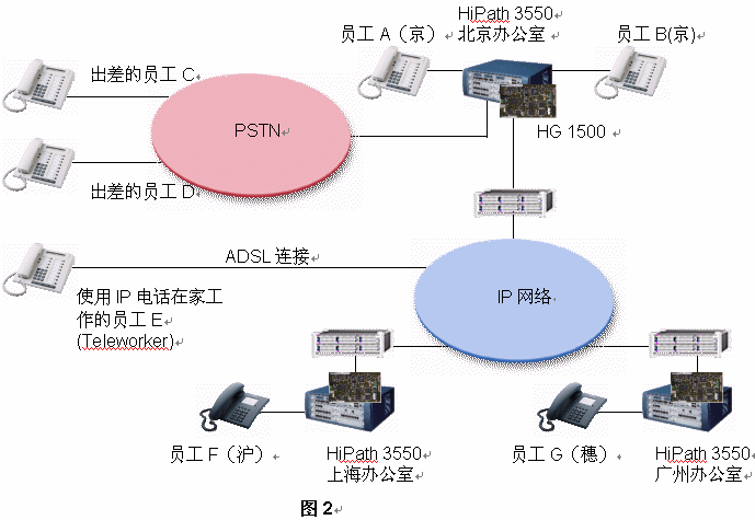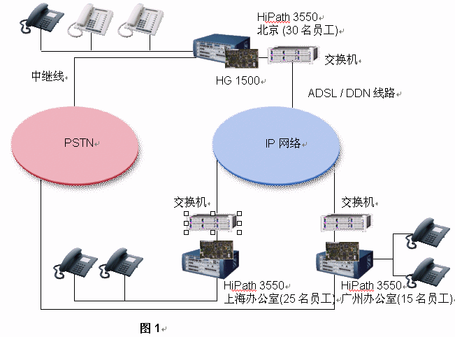 西門(mén)子推薦該公司每一個(gè)辦公室均采用HiPath 3550 PBX。如果,A公司每個(gè)辦公室已經(jīng)擁有DDN專(zhuān)線或ADSL連接至Internet,它就能將其內(nèi)部通信建設(shè)在現(xiàn)存的IP網(wǎng)絡(luò)的基礎(chǔ)之上。其集成網(wǎng)關(guān)HiPath 1500被用來(lái)連接數(shù)據(jù)網(wǎng)絡(luò)和語(yǔ)音網(wǎng)絡(luò)。在這樣的網(wǎng)絡(luò)架構(gòu)中,路由冗余能夠得到充足的保證,因?yàn)槲鏖T(mén)子HiPath解決方案提供了最大的網(wǎng)絡(luò)存活性:即使IP網(wǎng)絡(luò)出現(xiàn)故障,西門(mén)子網(wǎng)絡(luò)設(shè)置能夠?qū)⒙酚勺詣?dòng)切換至PSTN之上。