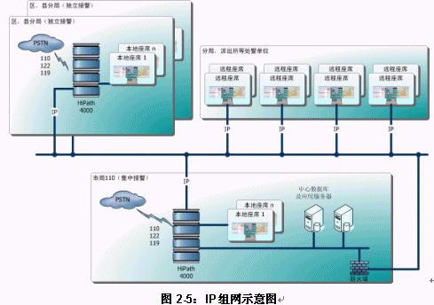 圖 2-5給出了使用純IP實(shí)施城市110組網(wǎng)的最普遍的示意。從該圖可以看出,無論采用集中接警還是分散處警,C&CC特別使用于使用純IP技術(shù)實(shí)施全市(包括所轄縣級(jí)市)110組網(wǎng)。考慮到目前全國公安二、三、四級(jí)網(wǎng)建設(shè)日漸成熟,使用純IP技術(shù)實(shí)施全市110組網(wǎng)并實(shí)現(xiàn)"三警合一"確實(shí)是經(jīng)濟(jì)、靈活而方便的選擇,前文提到的芬蘭112全國組網(wǎng)使用的也是這樣的技術(shù)。當(dāng)然,現(xiàn)存的傳統(tǒng)公安通訊專網(wǎng)仍然可以作為備份話務(wù)路由存在。
