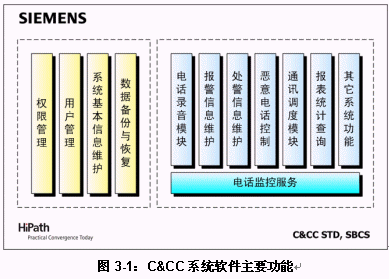C&CC是西門子指揮控制中心全面解決方案的核心。C&CC以有線(HiPath 4000)/無線(模擬和數(shù)字集群)通訊平臺(tái)為信息采集和資源調(diào)度基礎(chǔ),系統(tǒng)核心模塊包括:融合多種業(yè)務(wù)的接處警工作流,面向地理信息對(duì)象的資源管理,面向事件的案情與錄音管理,基于預(yù)案的輔助決策支持,以及多種統(tǒng)計(jì)、查詢和報(bào)表生成工具等。在此基礎(chǔ)上,C&CC還提供豐富的接口,確保與技防報(bào)警、圖像/視頻監(jiān)控和GPS