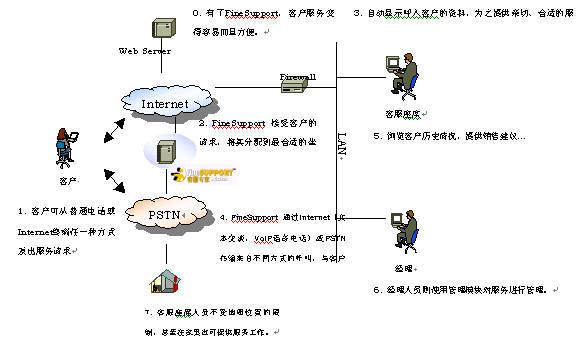 FineSupportTM網(wǎng)通呼叫中心解決方案主要由以下幾個部分組成:Media Gateway(接受來自IP網(wǎng)的網(wǎng)絡電話、傳統(tǒng)電話等呼叫,傳送給軟交換系統(tǒng))、Service Switch(軟交換系統(tǒng),負責呼叫控制)、IP IVR(存儲顧客呼叫信息,播放語音提示信息)、Soft ACD(呼叫分配服務器,可定制多種分配策略)、Web Server(負責報表管理、站點管理和監(jiān)控、FAQ存儲管理、留言及文本交談管理等)、Chat Server(建立交談通道)、Remote Agent(坐席工作站。通過客戶端軟件進行客服支持)。