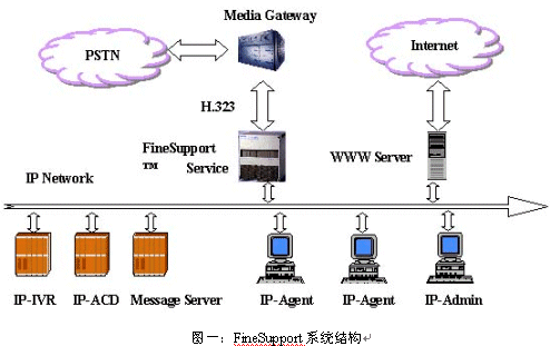 Finesupport是一個完全基于IP網(wǎng)絡的呼叫中心,不同于智能網(wǎng)應用或CTI應用。其應用建立在Soft Switch體系之上,媒體流總是在第一時間被報文化,成為數(shù)據(jù)流,此后整個應用系統(tǒng)中處理的完全是數(shù)據(jù),主要通過軟件來實現(xiàn),因而在降低成本、開展新業(yè)務、平滑升級方面具有極大的優(yōu)勢。