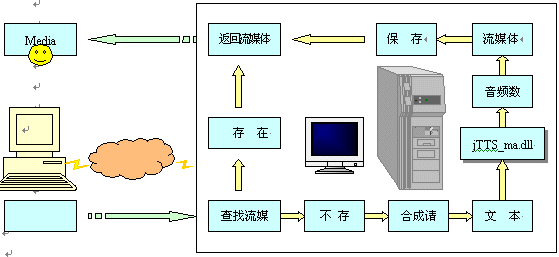 瀏覽器端(Explorer)發(fā)出瀏覽請(qǐng)求,網(wǎng)站服務(wù)器(IIS)根據(jù)請(qǐng)求查找流媒體(音頻流)文件,如有,則將流媒體返回客戶端,并啟動(dòng)客戶端的MS media player播放流媒體。若沒有,則向語音服務(wù)器(jTTS Service)發(fā)出合成請(qǐng)求,并將所需合成的文本通過Socket接口傳送至語音服務(wù)器;語音服務(wù)器響應(yīng)網(wǎng)站服務(wù)器的合成請(qǐng)求后,將調(diào)用jTTS合成技術(shù)進(jìn)行語音合成,并調(diào)用WMF SDK將生成的音頻文件轉(zhuǎn)換成流媒體格式ASF;通過Socket接口返回IIS服務(wù)器端后,將此流媒體文件存儲(chǔ)到指定的Web目錄,同時(shí)將流媒體返回瀏覽器端,啟動(dòng)MS media player播放。其流程如下: