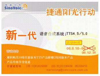 2006年8月18日,捷通華聲正式發(fā)布新一代語音合成系統(tǒng)jTTS4.5,同時(shí)啟動(dòng)了為期三個(gè)月的“陽光行動(dòng)”。行動(dòng)一經(jīng)推出,立即引起了強(qiáng)烈的市場反響。每日致電(86-10)82826886咨詢jTTS4.5產(chǎn)品及價(jià)格詳情的客戶接連不斷,通過訪問捷通華聲語音合成在線演示系統(tǒng)http://www.sinovoice.com.cn/2-e-1.asp或者撥打24小時(shí)產(chǎn)品演示熱線(86-10)82826886-8624體驗(yàn)合成效果自然度和流暢度的用戶絡(luò)繹不絕,定購產(chǎn)品享受累積購買10線任意版本TTS附贈(zèng)2線同版本產(chǎn)品等優(yōu)惠政策的合作伙伴更是紛至沓來。大家都對(duì)jTTS4.5的新增甜美音色大加贊賞,更對(duì)jTTS4.5合成效果自然度和流暢度的提升給予了極大的肯定及滿意,同時(shí)表達(dá)出希望能延長活動(dòng)時(shí)間的誠懇建議。為答謝新老客戶對(duì)捷通產(chǎn)品的關(guān)注與厚愛,捷通公司特決定將“陽光行動(dòng)”活動(dòng)時(shí)間延期至12月31日。