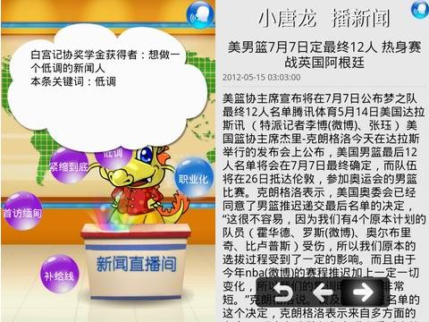 CTI論壇(ctiforum)5月17日消息(記者 歐陽): 2012年5月9日,中國第一個全方位智能交互手機(jī)助手“小唐龍”正式上線,小唐龍是一個基于Android系統(tǒng)的智能手機(jī)助手,它可隨時隨地幫助手機(jī)用戶進(jìn)行聊天、歌曲點(diǎn)播、聽新聞、地圖導(dǎo)航、互聯(lián)網(wǎng)信息查詢等多方面服務(wù),其中《唐龍新聞》以新穎獨(dú)特成為小唐龍的閃亮點(diǎn)。當(dāng)拿起手機(jī)對著“小唐龍”說,“聽新聞”,“小唐龍”的播報(bào)便即刻開始——天下大事早知道,由我唐龍給您報(bào),我們來看今天的唐龍新聞。