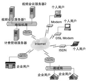 用戶可通過(guò)從56K撥號(hào)上網(wǎng)直至寬帶等各種方式接入該視頻會(huì)議系統(tǒng),包括PSTN撥號(hào)、ISDN撥號(hào)、ADSL撥號(hào)、LAN、PLC(低壓電力載波)等各種形式,在這個(gè)統(tǒng)一的視頻會(huì)議平臺(tái)上,實(shí)現(xiàn)多路音頻、多路視頻、文檔共享、電子白板、協(xié)同瀏覽、文件傳輸、文字交流等功能。系統(tǒng)的拓?fù)浣Y(jié)構(gòu)圖如左所示。